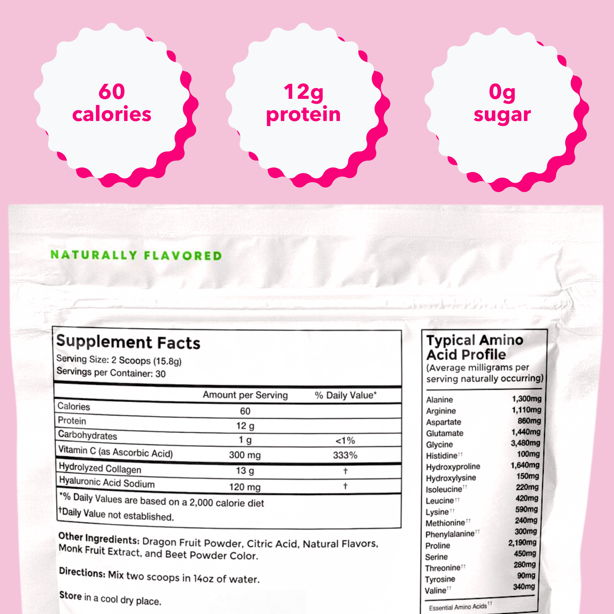 Pinky Collagen contains a variety of natural fruit flavors but dragon fruit is the star of the show. Dragon fruit not only adds a pink flare to Pinky but also contains prebiotics and fiber, which support healthy gut function, and antioxidants that improve skin health and help lower the risk of disease.